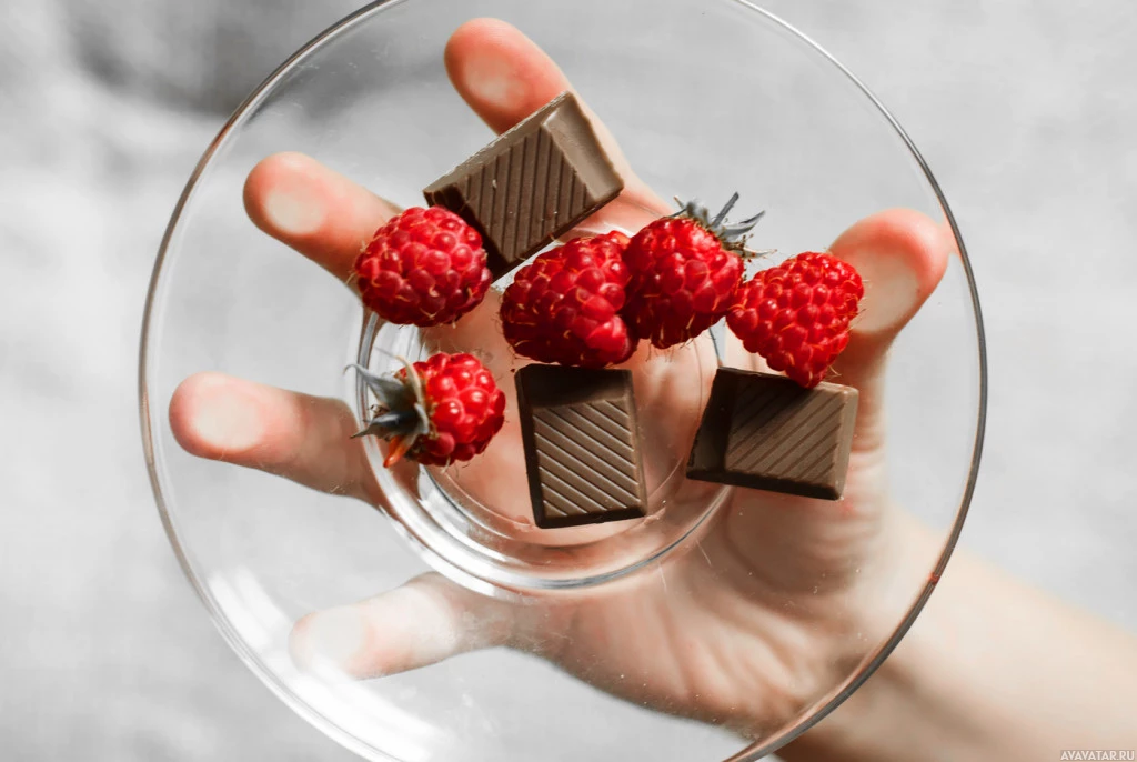 glass bowl filled with raspberries. On top of the berries, there are chocolate-covered raspberries. There is also an additional chocolate square placed outside of the bowl and to the side, resting on what appears to be a surface like a table or countertop. The focus of the image is on the combination of fresh fruit with