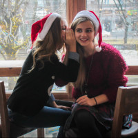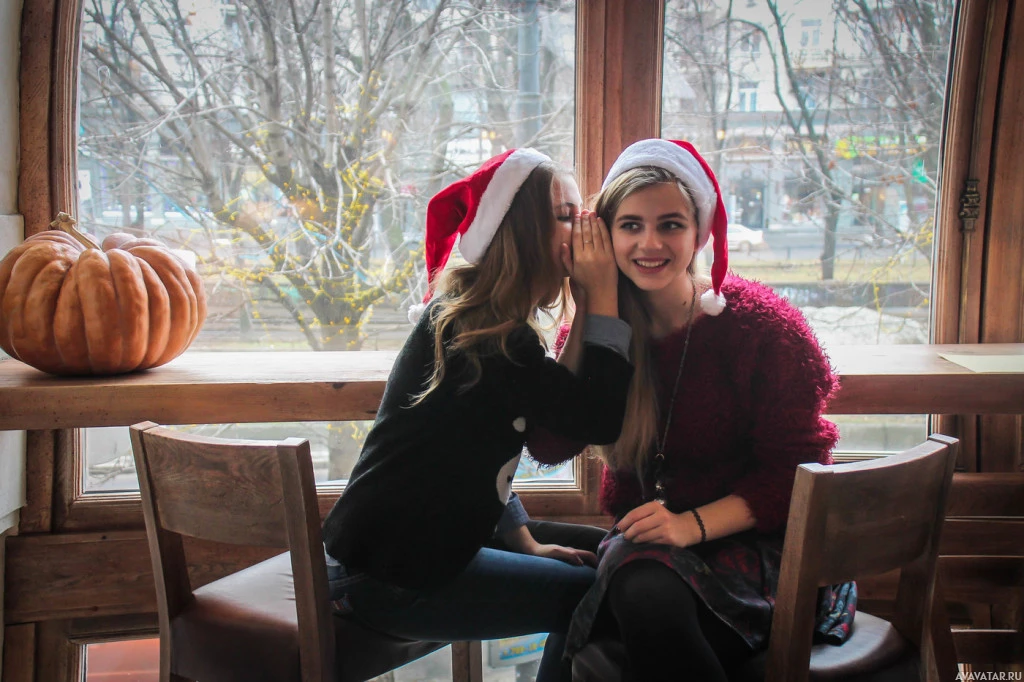 indoor setting, possibly a cafe or a restaurant with Christmas decorations. One woman is whispering in the ear of the other, who seems to be smiling and enjoying the moment. There's a warm and festive atmosphere suggested by