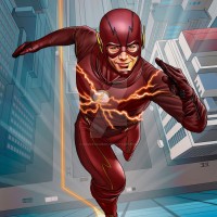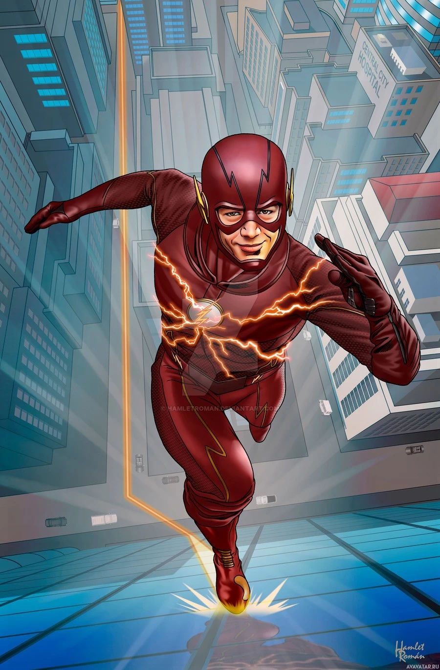 a dynamic pose, and there are lightning effects around him which represent his speed power. The background suggests