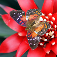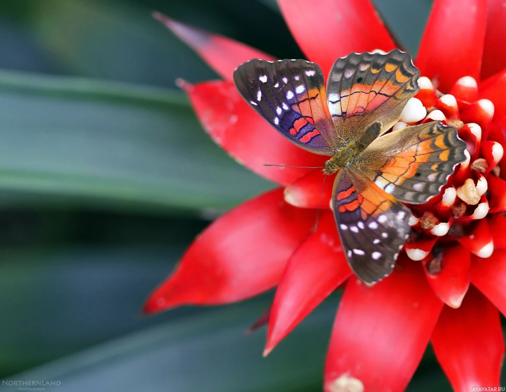 red flower with small white seeds at the center, which appears to be a type of protea. A butterfly is perched on the flower, enjoying the nectar it offers. The butterfly has brightly colored wings that are predominantly blue and orange, adorned with patterns. There are also hints of white and black coloration in its wings. The background seems to be a green foliage or plant material, providing
