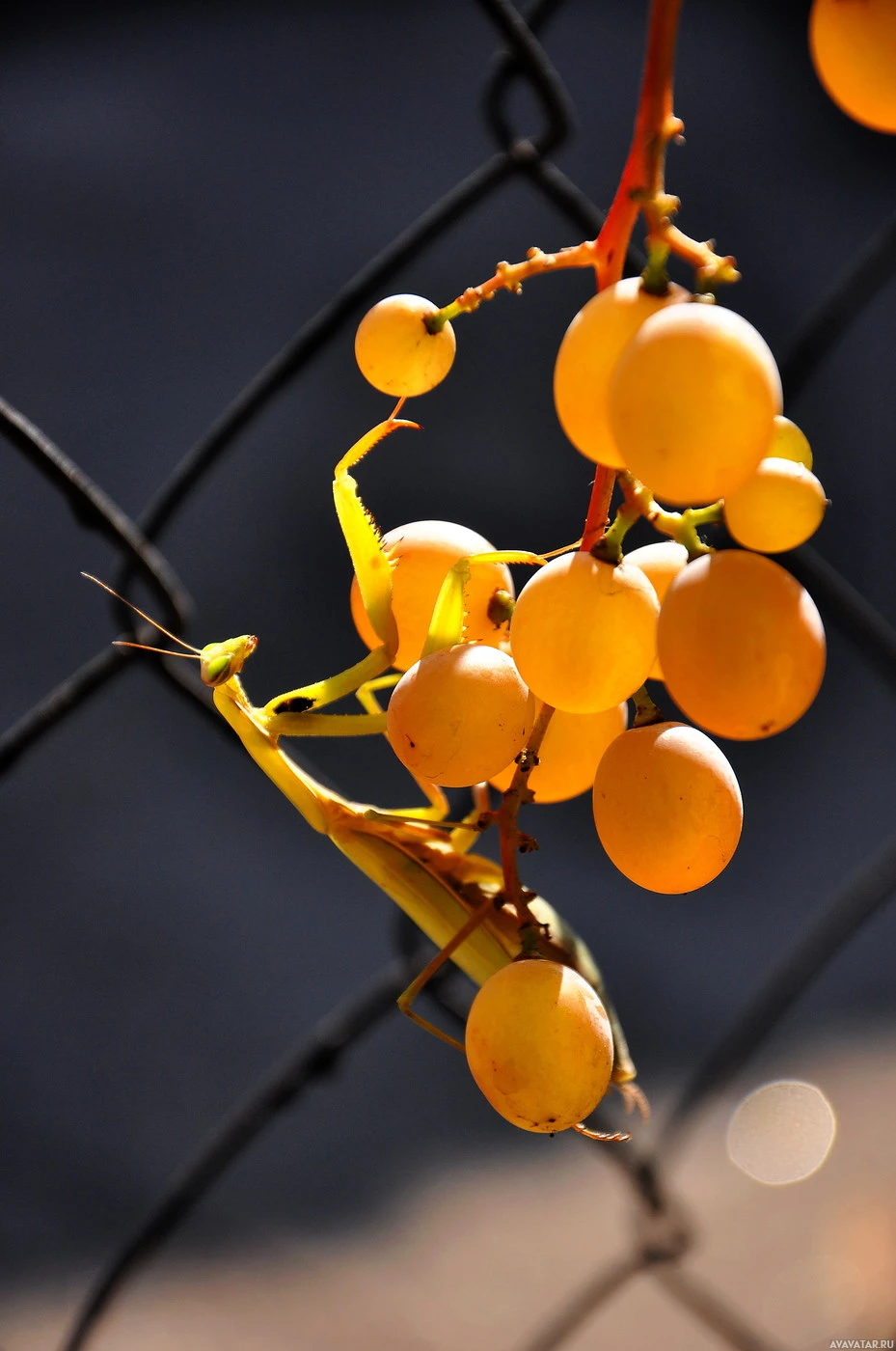 yellow grapes hanging from a vine. The grape vine appears to be growing on or near