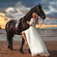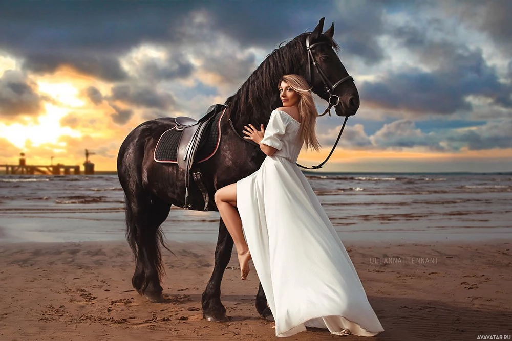 a white dress and is barefoot, which suggests that she might have just dismounted from the horse. Behind them, there's an expanse of