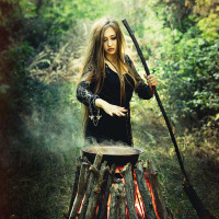 closed eyes suggest she may be in a moment of contemplation or performing a ritual. The overall atmosphere of the image could be interpreted as mystical or fantastical, aligning with