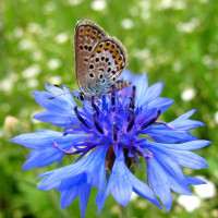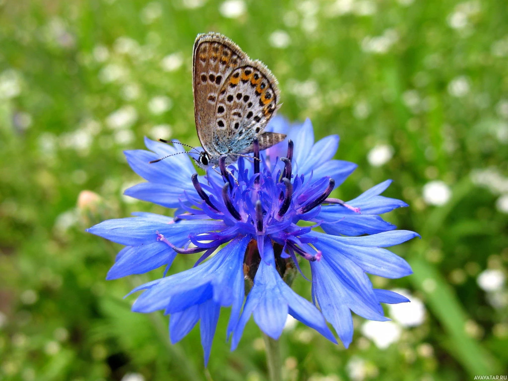 На картинке есть бабочка, сидящая на вершине синего цветка. Фон кажется пышным зеленым полем с различными растениями и цветами, что согласуется с естественной обстановкой на открытом воздухе, вероятно, садом или лугом.