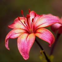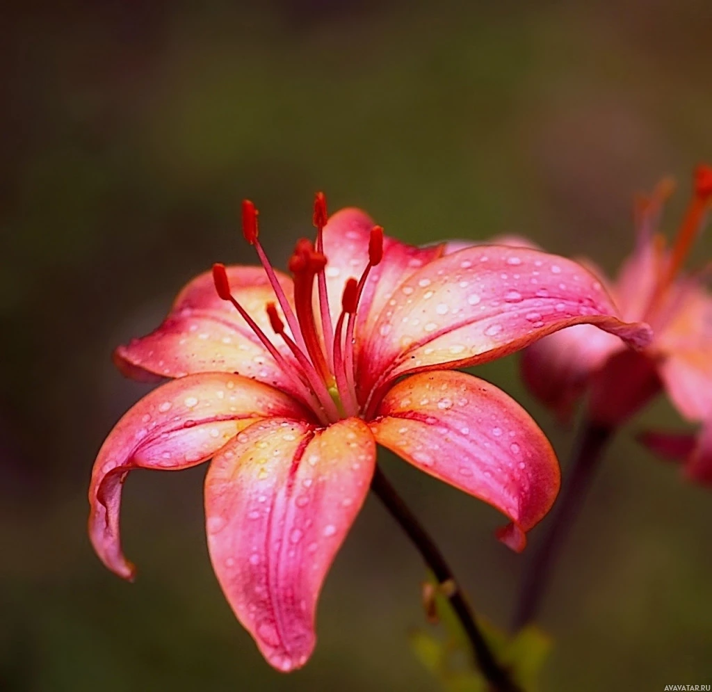 На картине изображен крупный план цветка с красными лепестками и желтыми пятнами, обычно известными как лилия. Кажется, что идет дождь или только что пошел дождь, учитывая капли, видимые на лепестках цветка.