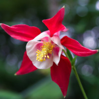 red petals and white edging, commonly known as an Indian paintbrush (Castilleja indivisa) or similar species. It stands out against the natural background, which appears to be a lush green environment, possibly in