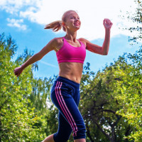 a young woman who appears to be running. She is wearing workout attire, which includes