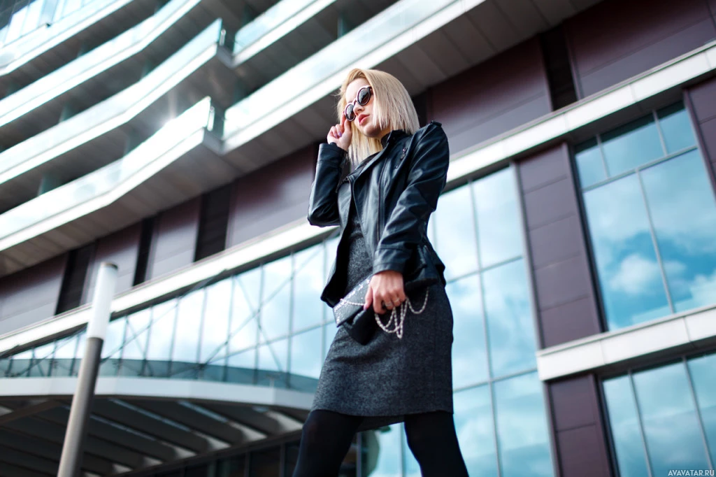 In the image, there is a woman standing in front of a modern building. She has blonde hair and is wearing sunglasses. She appears to be dressed casually, with a leather jacket over a dark shirt or dress. The setting suggests an urban environment during daytime due to the clear sky and bright lighting.