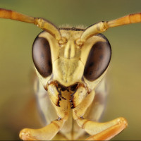 The image shows a close-up of an insect, which appears to be a type of wasp. It has the distinctive features typical of wasps, such as the narrow waist, wing membranes, and