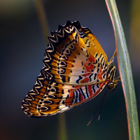 colorful wings with patterns that could indicate a specific species, although the exact type is not clear from this angle without a closer view of its markings and identification features. It's a close-up shot with a focus on the butterfly, capturing its vivid colors and delicate structure against the backdrop of