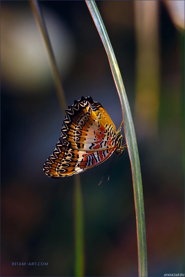 The image shows a butterfly perched on what appears to be a reed or grass blade. The butterfly has