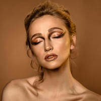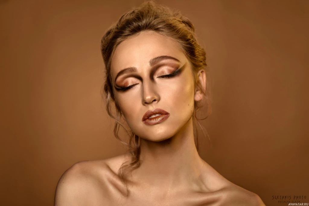 tan tone on the skin. They have their eyes closed and are looking slightly away from the camera with