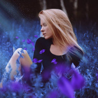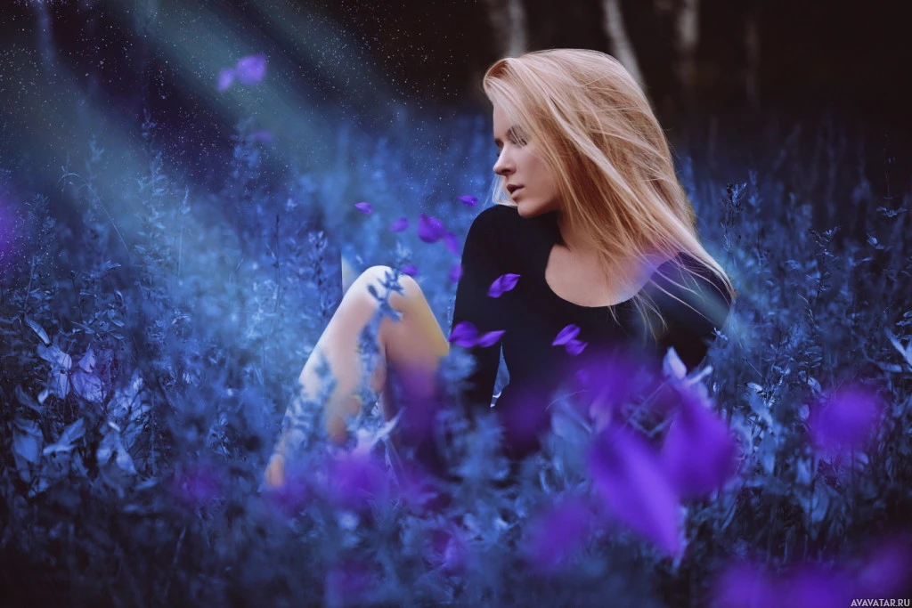 blonde hair. In the background, there are blue flowers that could possibly be lavender or similar species, and the sky is visible with a faint glow that might suggest either