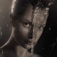 the surface of the water, which creates an interesting effect with her expression and the reflection on the water's surface. The lighting in the photo gives it