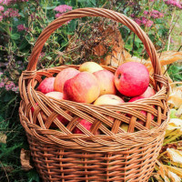 red apples, placed outdoors. To the side of the basket, there are
