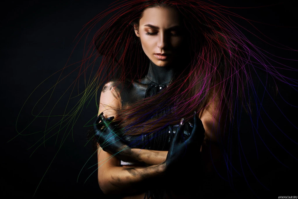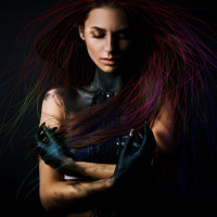 digital art or imagery surrounding her, such as lines or shapes that may be part of the composition. The woman has