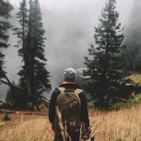 outdoor attire suitable for hiking or trekking, including what seems to be a backpack and possibly a hat. There are trees scattered in the background that suggest