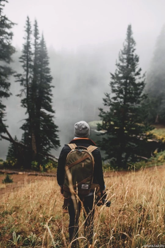 The image shows a person standing on a grassy hillside with mist or fog, which contributes to a somewhat