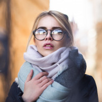 an urban setting, possibly during winter given the attire she's wearing, which includes a scarf wrapped around her neck for warmth.