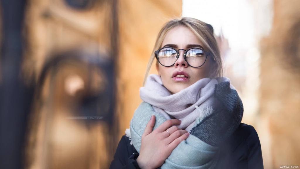 a young woman with blonde hair. She's wearing glasses and has her hand near her chest, possibly adjusting or removing them. The background suggests