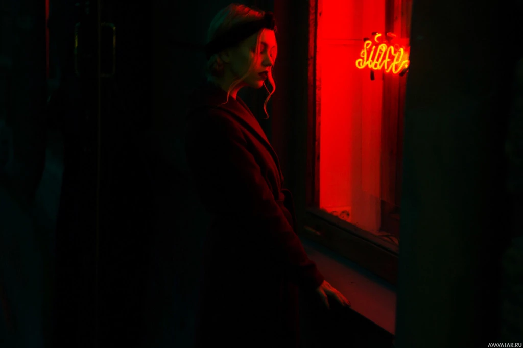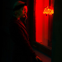 red lighting, and there is neon sign that appears to be lit with the word "SLOP." The individual is facing away from the camera, and their head is turned towards the window, as if they are looking at something or