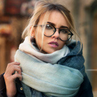 The image features a woman wearing glasses and a scarf around her neck. She has