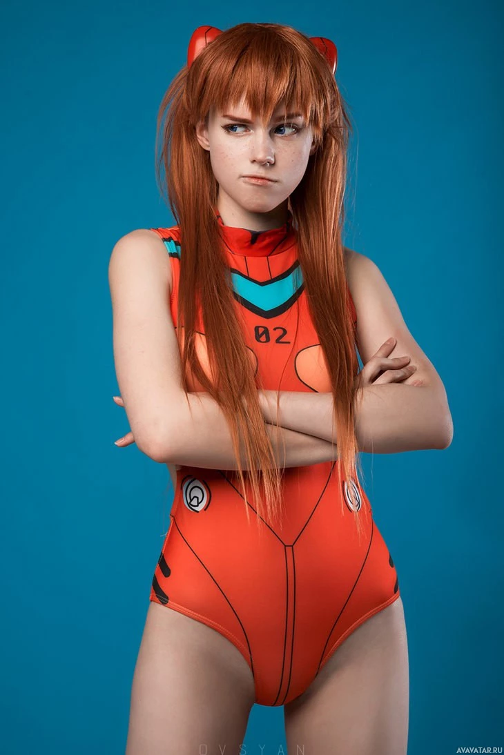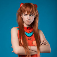 facial expression suggests they are in character as Asuka Langley, giving off a serious or intense vibe typical of her persona in the series.