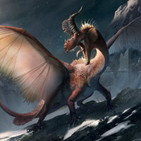 a fantasy scene featuring two dragons. One dragon is flying and appears to be larger with wings that are spread wide, suggesting motion or flight. The other dragon is standing on the ground with its body twisted in an exaggerated posture, possibly indicating agitation or