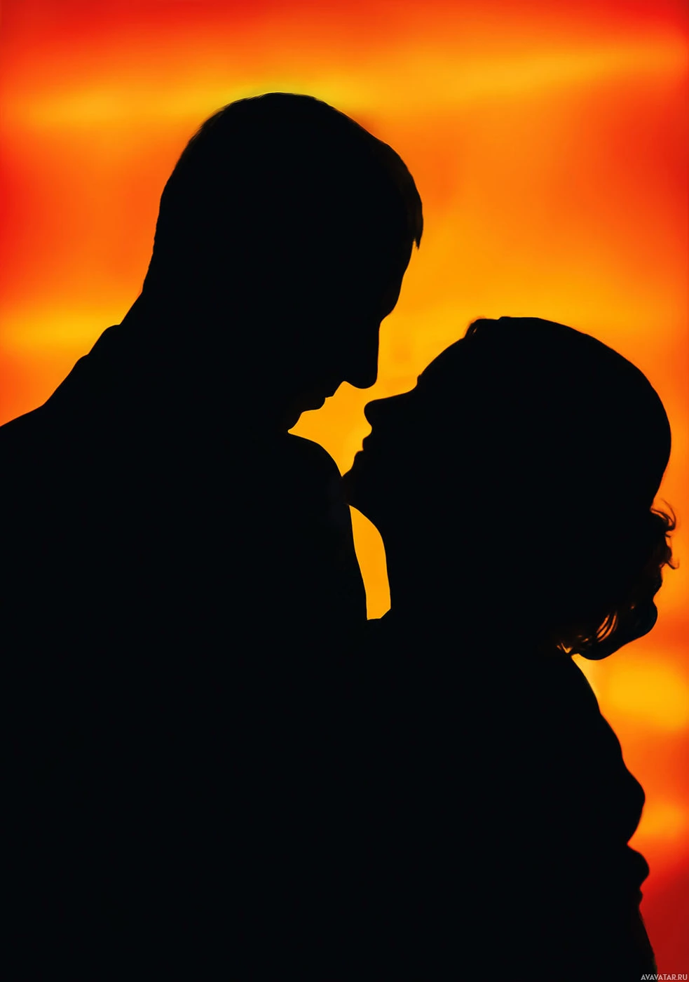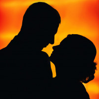 The image depicts a silhouette of two figures facing each other against an orange-