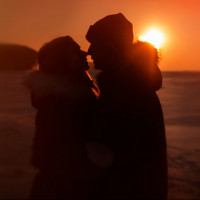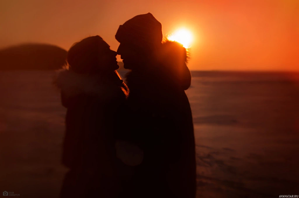 an intimate moment. They are silhouetted against the backdrop of a setting or rising sun, which creates a warm,
