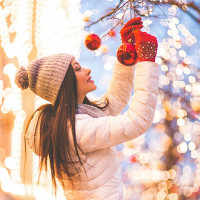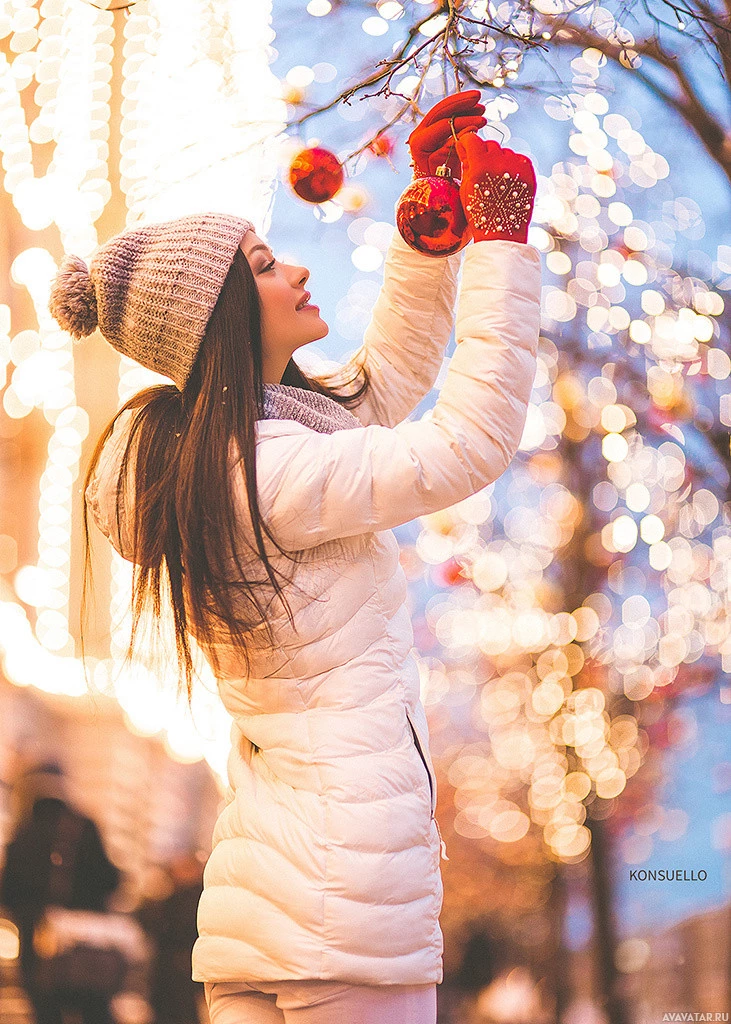 На картинке изображен человек, украшающий рождественскую елку. Она носит зимнюю одежду, в том числе белое пальто и шляпу-беани с помпоном сверху. Есть огни, украшающие фон, которые указывают на то, что эта сцена может происходить в праздничный сезон. Человек, кажется, находится в праздничном настроении, занимаясь актом наложения украшений на ветви дерева.