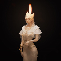 a humanoid shape with human-like features, including arms and legs, but she also has a tail and what seems to be gills or fins on her neck and shoulders. Her attire is ornate, suggesting a royal or ceremonial status, possibly inspired by ancient or fantasy themes. She is holding a candle in one hand, which might be symbolic of divinity or purity. The lighting and the pose give an ethereal and majestic appearance to the character.