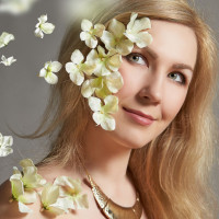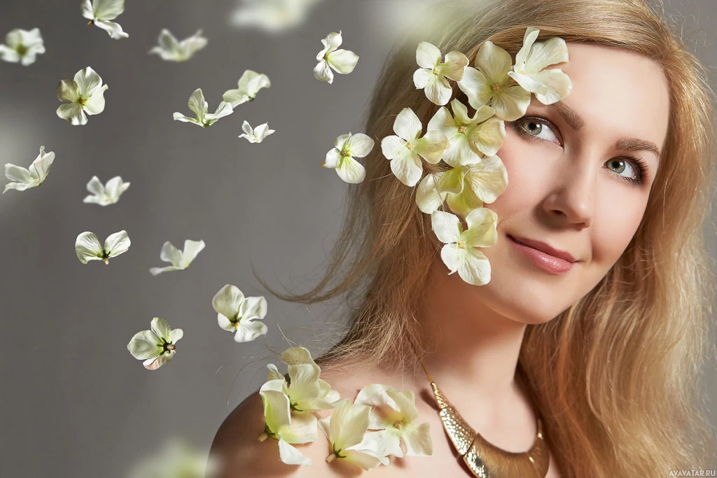 white flowers falling from above, giving an impression that they are part of her hair or floating around her head. The background is neutral, which helps to focus attention on the woman and the flowers.