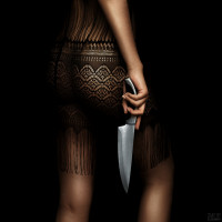 The image shows a figure standing with one hand holding what appears to be a knife. The person is wearing a patterned garment that could suggest a historical or fantasy context, such as Native American-style clothing. The lighting is moody and dramatic, which might indicate the photo is meant to convey a sense of danger or suspense.