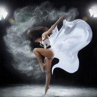 dark hair. She appears to be in motion, dancing or possibly performing some sort of