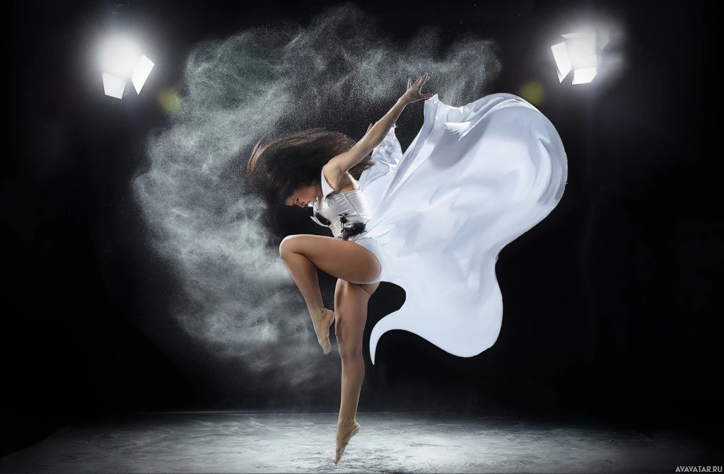 acrobatic pose. Her attire is flowing and white, which could indicate she is wearing