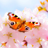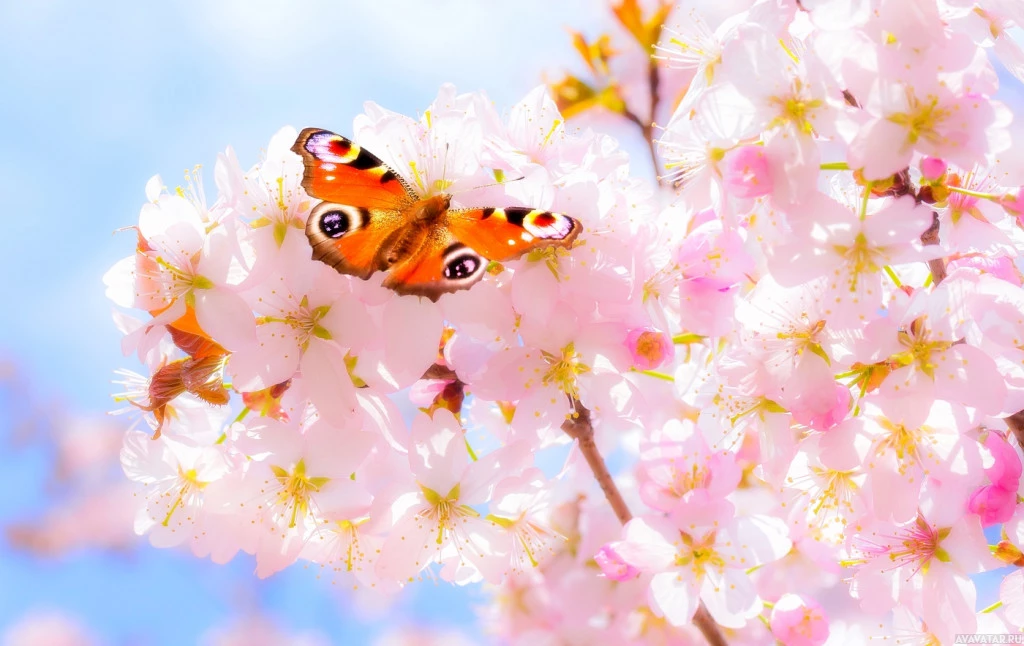a beautiful scene of spring. There is a butterfly resting on a branch, which appears to be a cherry blossom tree due to the vibrant