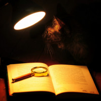 На картинке изображен кот, сидящий перед открытой книгой, освещенной настольной лампой. На страницах книги также находится увеличительное стекло, которое предполагает, что оно могло быть использовано для чтения или изучения.