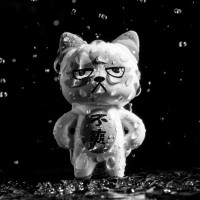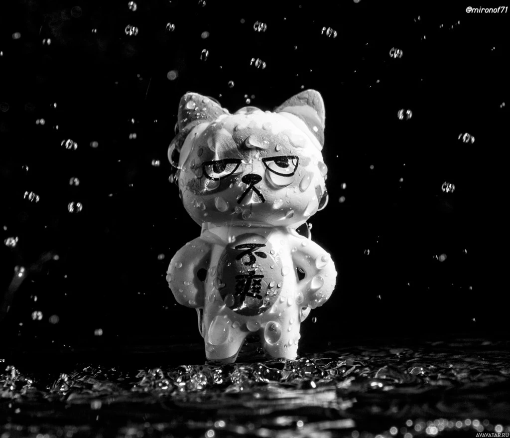 The image features a toy, specifically a figure resembling a cat, standing in