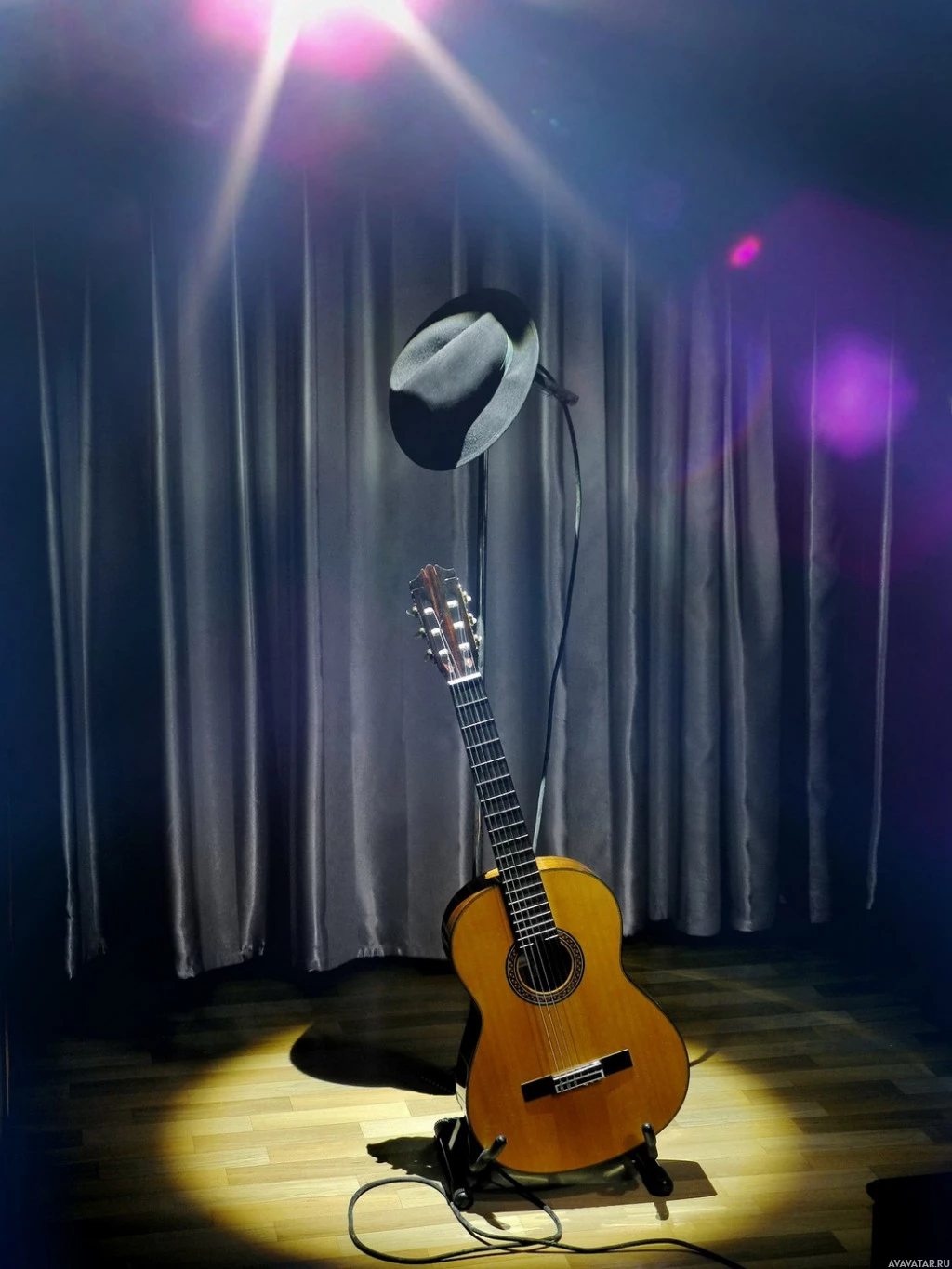 The image shows a classical guitar standing on a stage, with a microphone stand placed in front of it. A black hat is perched atop the microphone, and there are spotlights shining above the stage, creating