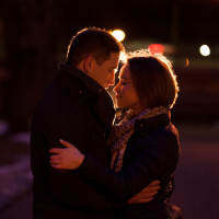 an affectionate gesture, with the man embracing the woman. They seem to be sharing