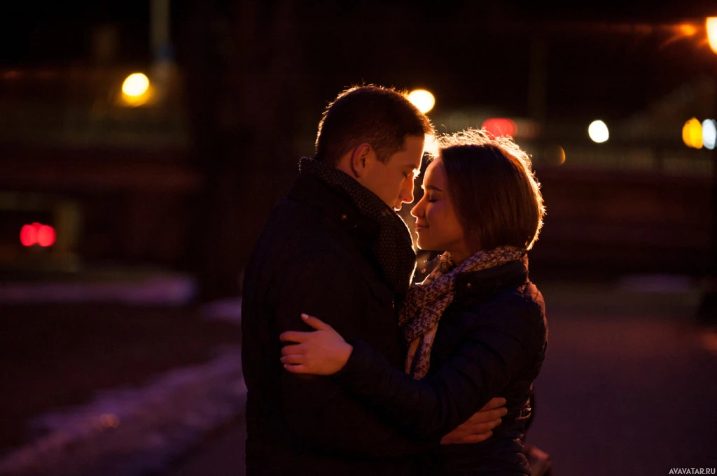 a warm ambiance to the scene. The man and woman are dressed in what appears to be cool