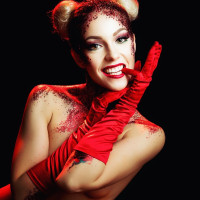 a red dress, with theatrical makeup including lipstick. They have