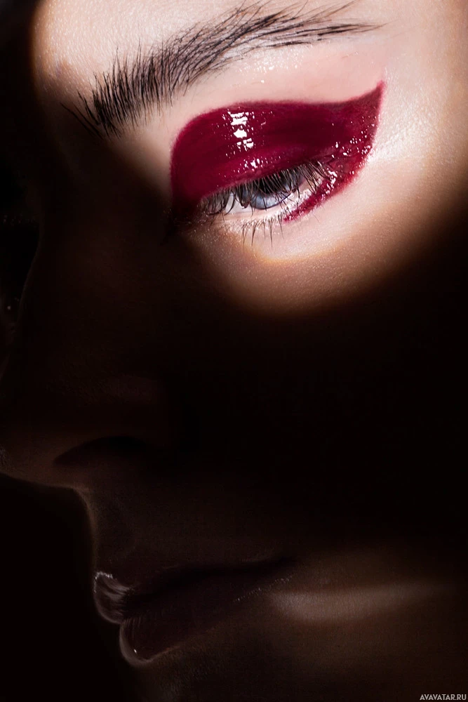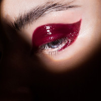 the eye area. There is prominent makeup applied to the eyelid and around the eye, creating