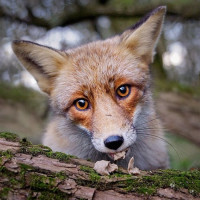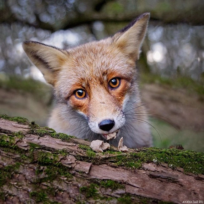 The image shows a fox, which is an animal known for its distinctive red or reddish-brown fur and bushy tail. It appears to be in the woods or