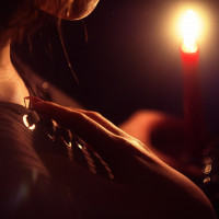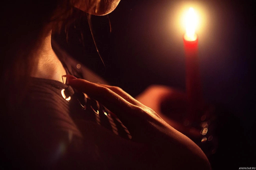 a lit candle. On the left side, the person is looking down at the flame, while on the right, they are seen from behind, with their hand resting on what appears to be a decorative surface or