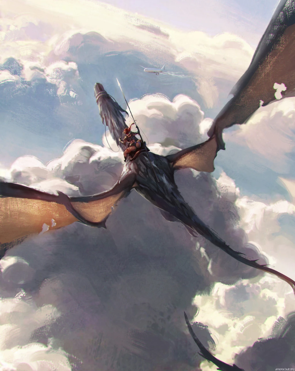 a fantasy scene with a dragon soaring through a cloudy sky. A person is riding on