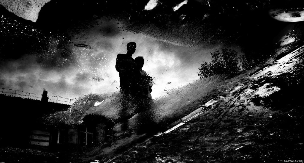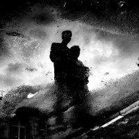 the wet surface. The overall mood of the image seems somber or reflective due to the silhouette against the desaturated background.