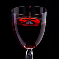 The image shows a glass of red wine. The glass appears to be half full, and there is a single drop of wine at the top, possibly indicating it's freshly poured or the start of a new serving.