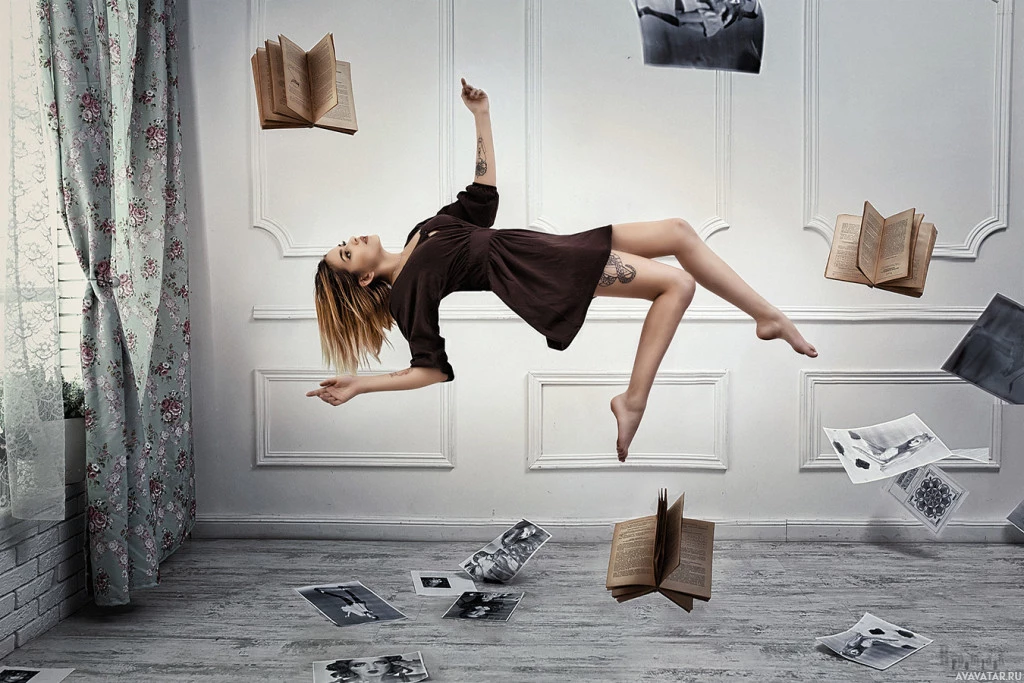 a girl in mid-air, seemingly floating or levitating above a room filled with books. She is wearing